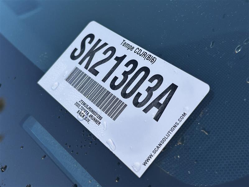 Black 2022 Toyota 4Runner 4WD 4D Sport UtilityClean CARFAX. 16/19 City/Highway MPG4.0L V6 DOHC 24V 5-Speed with ECT 4WD, Black/Graphite Cloth.At Tempe CJDR and Kia, we are committed to providing our customers with SAFE and RELIABLE vehicles at the RIGHT PRICE! All pre-owned vehicles are subject to an extensive 110 point inspection, and ALL reconditioning costs are already included in the price of the vehicle. *Tempe $1,000 Finance Bonus Cash discount only available for standard prime lender conventional financing arranged through Tempe Dodge OAC. We reserve the right to determine customer eligibility for the $1,000 Tempe Finance Bonus Cash discount.
